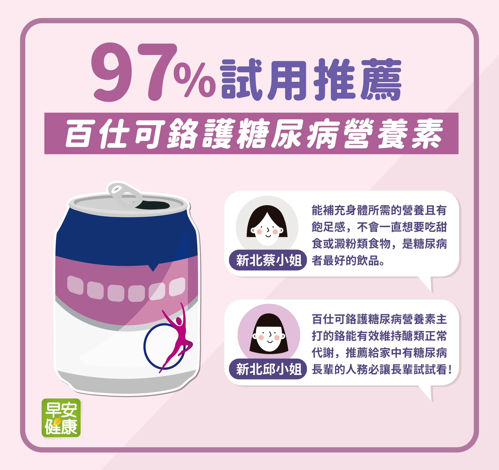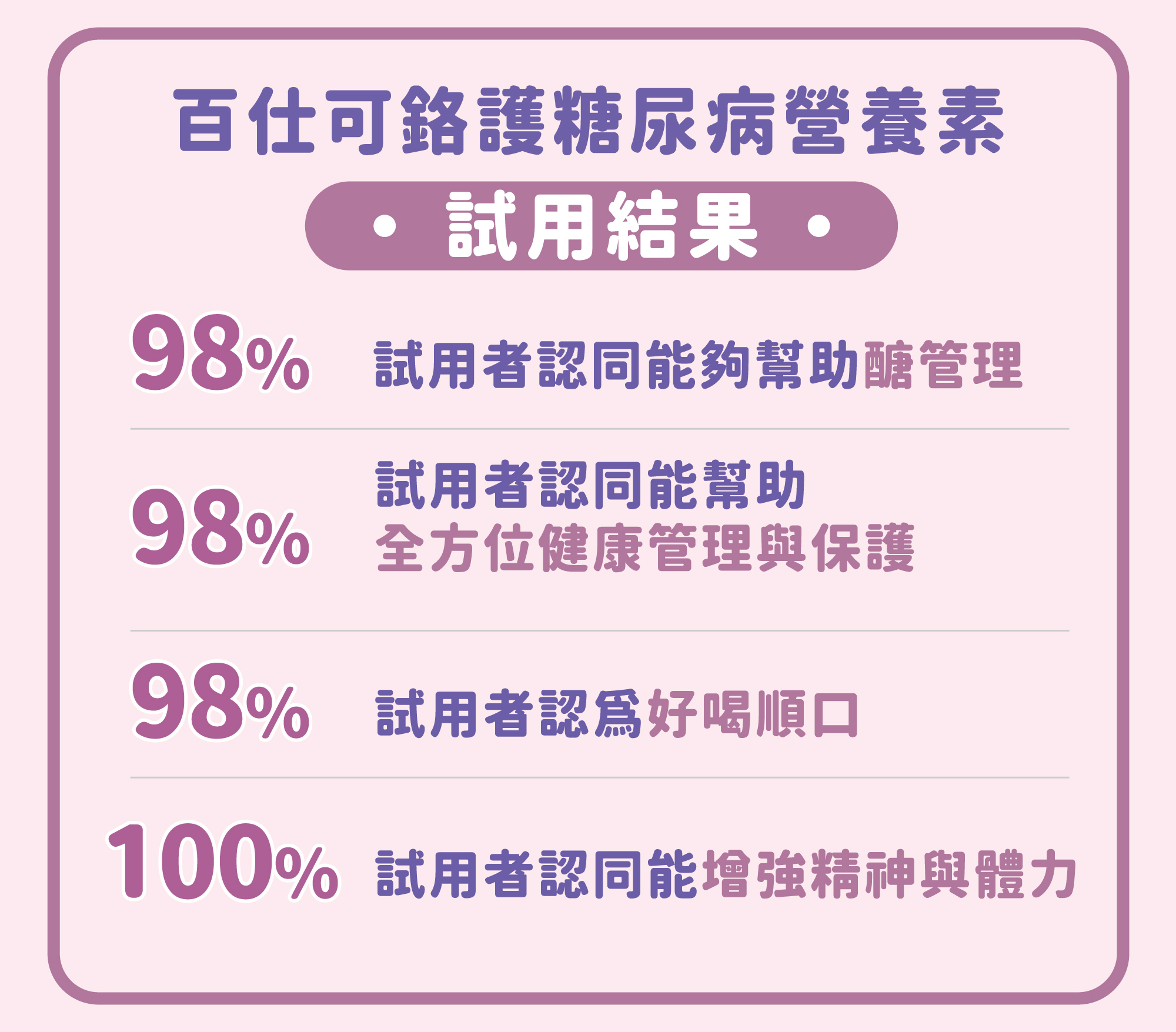 早安健康與百仕可徵集百位試用者試飲實測 3 ,回饋結果皆獲得高比例的認同。有97%的試用者願意推薦給其他糖尿病患者飲用!高達98%的民眾認為飲用「鉻護糖尿病營養素」能幫助醣管理,其成分添加有助醣類正常代謝的「鉻」、維持生理機能的「膳食纖維」,以及可促進新陳代謝「肌醇」,在維持糖友營養基礎的同時,也達到3重穩固的功效。