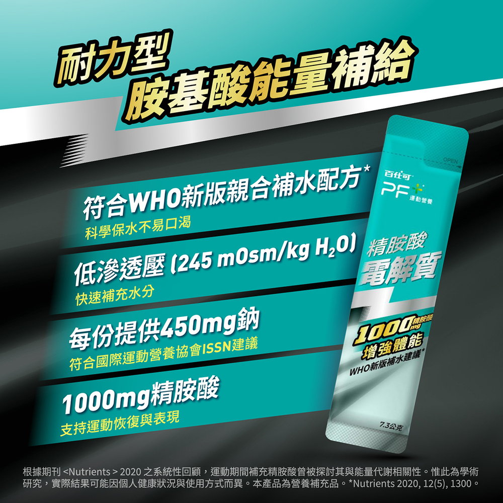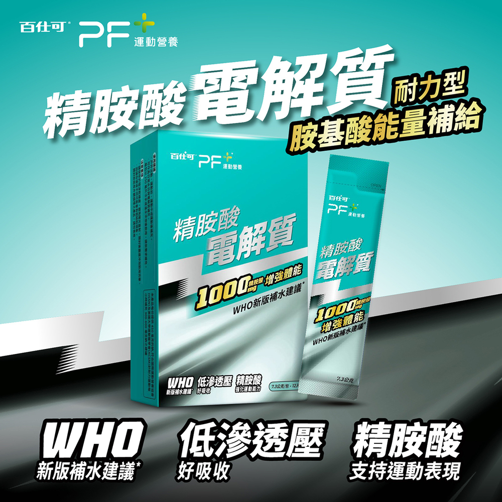 市售運動飲料通常含糖量較高,喝了容易攝取到多餘熱量。PF+運動營養精胺酸電解質屬於低滲透壓配方,除了基本電解質外,還添加精胺酸。可幫助補充運動流汗後流失的營養素,同時補電解質與水分。